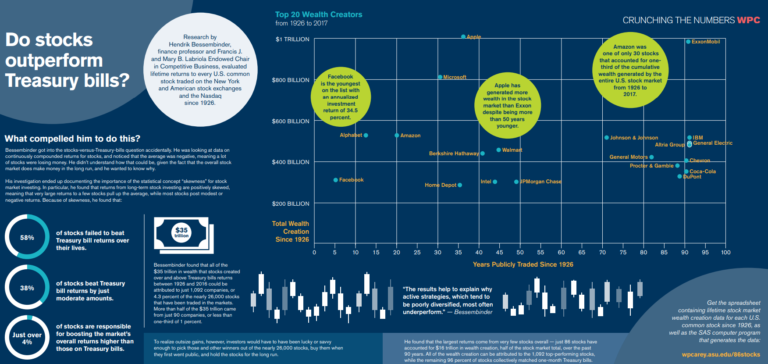 Bessimbinder found just 86 stocks accounted for half of all wealth creation in the U.S. stock market going back to 1926. All of the wealth creation in that time came from just 4% of stocks. Nearly 60% of stocks failed to beat T-bill returns over their lives. Close to 40% of stocks barely beat T-bills.