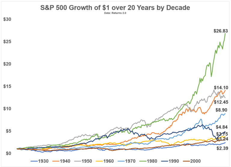 I calculated the growth of $1 invested in the S&P 500 over a 20 year period at the start of each decade going back to the 1930s: