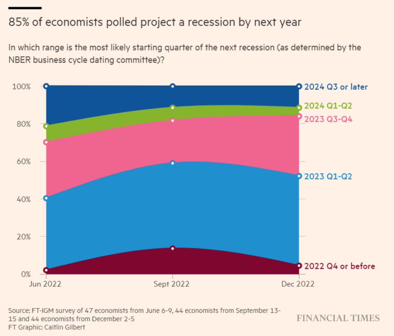 1. What’s something people are generally certain about that will be proven wrong? Back in December 2022, the Financial Times published a survey that showed 85% of economists were projecting a recession in 2023: