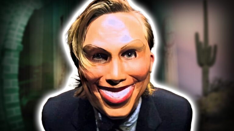 When hacked by Carmelo’s group, it glitches out and momentarily reveals a hidden message. ♪ Upbeat Music ♪ Probably the most iconic new villain in this second Purge movie is this guy, who for obvious reasons, I’ll just call “Godhead.” It seems that he’s labeling himself as God, a decider of who lives and who dies. Halfway through the annual Purge, Carmelo’s revolutionary group taps into the video feed