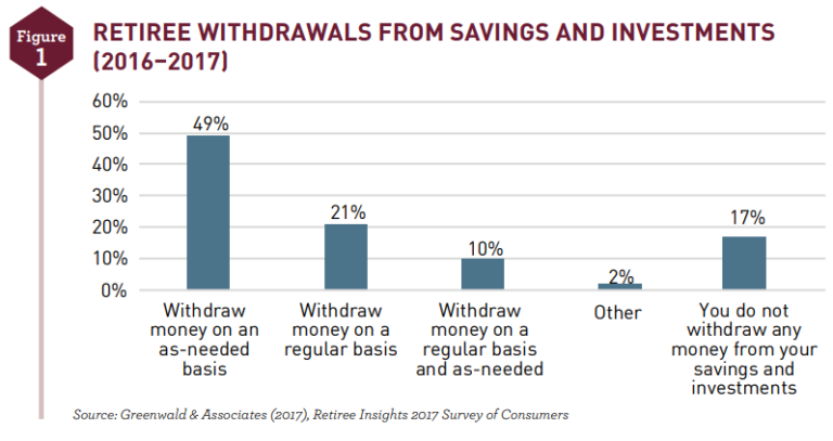 Findings from a 2023 New York Life study show that only 16% of retirees withdraw from their portfolios on a regular, systematic basis and 30% do not withdraw any money from their savings accounts and investment portfolios at all.Â