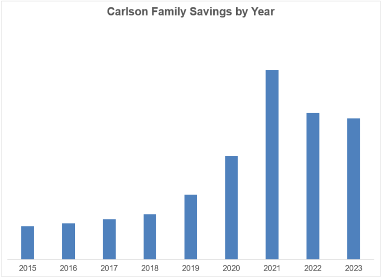 That’s the biggest reason our savings fell off a little in 2022 and 2023. We took a bunch of trips. We did some minor renovations to the house that added hangout spaces. We bought a boat. We own a lake house.1