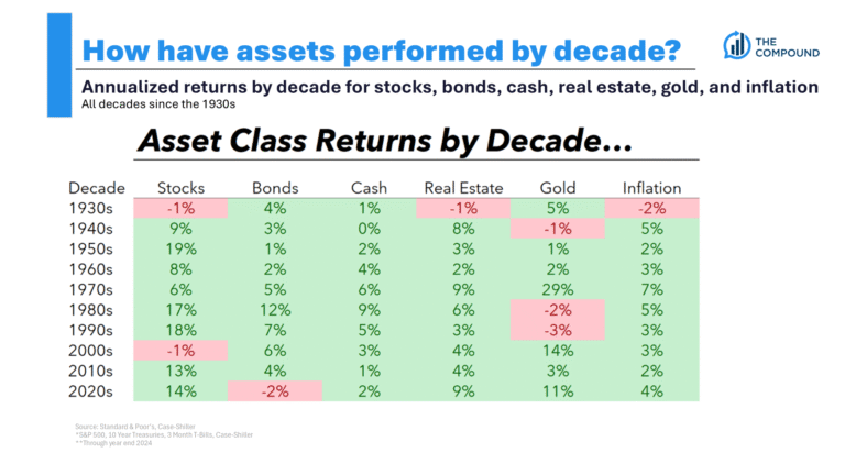 Gold did pretty well in all of those periods. Bonds held up well in the 1930s and 2000s but got crushed by inflation in the 1970s. Housing crashed during the Great Depression but performed phenomenally in the 1970s and 2000s.