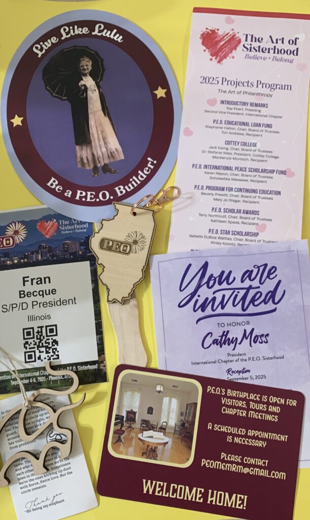 Five years ago in the midst of pandemic cleaning (little else to do when everything was closed), I had time to read the inscription on a book given to me by a member of the Special Committee. A Past State President (PSP) of Oklahoma State Chapter encouraged me to think about state board service. It was something I never considered because Illinois is such a big state, both in size of the state and in terms of P.E.O. chapters. Illinois currently has 303 chapters and 11,000+ members. It is third in terms of membership and fourth in number of chapters. I knew it would be a very large commitment.