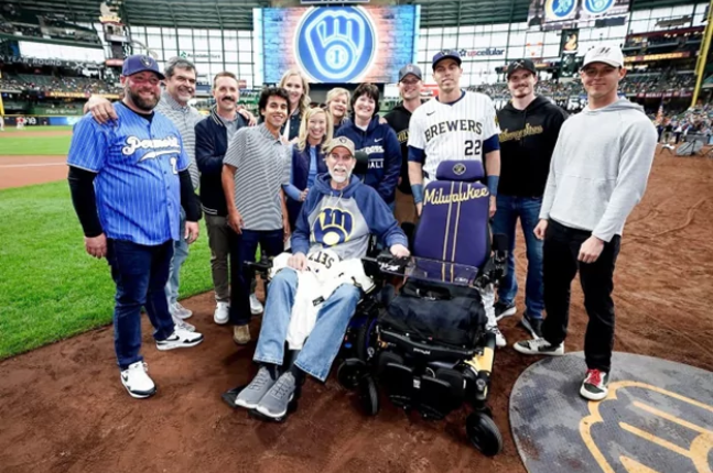 Before the Brewers’ ALS awareness game on April 19, Live Like Lou was honored at Christian Yelich’s third annual Home Plate Charity Concert, which raised over $175,000 with support from the Goo Goo Dolls and the Nicotine Dolls. Executive Director Wendy Faust took the stage to share our mission and the urgent need to support ALS families. Brewers fan Mike Seitz was surprised at American Family Field two nights later.