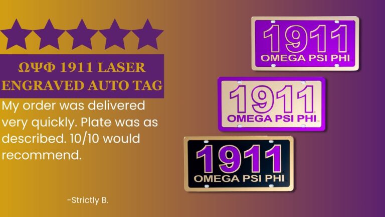 Omega Psi Phi 1911 Laser Engraved Auto Tag | Omega Psi Phi Paraphernalia at Betty’s Promos Plus