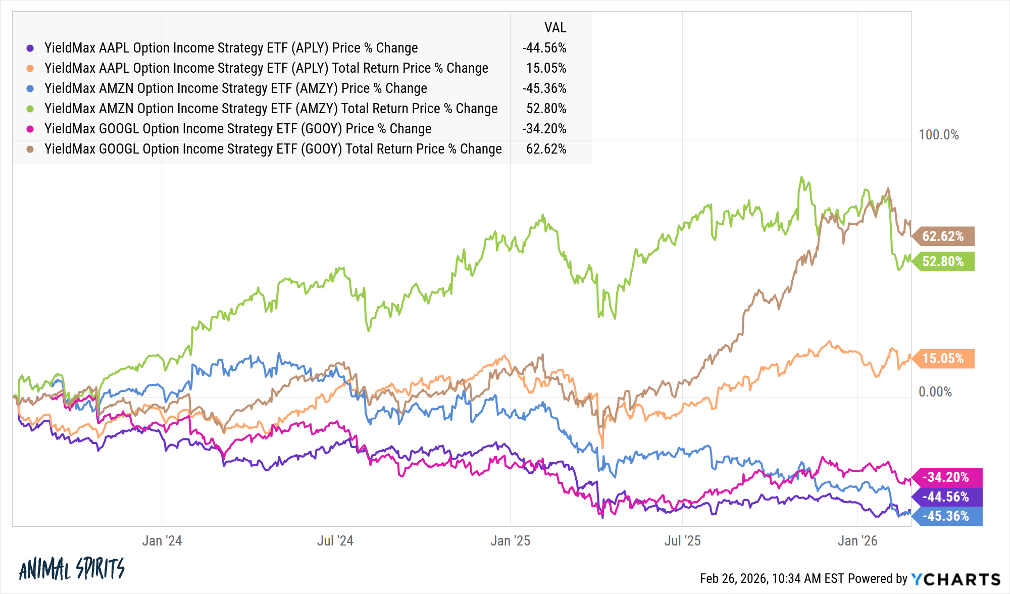 I would be remiss if I didn’t mention the single stock covered call strategies that have become all the rage in recent years. YieldMax has ETFs that sell calls on individual stocks. Right now the covered call ETFs for Amazon, Google and Apple yield 43%, 39% and 37%, respectively.