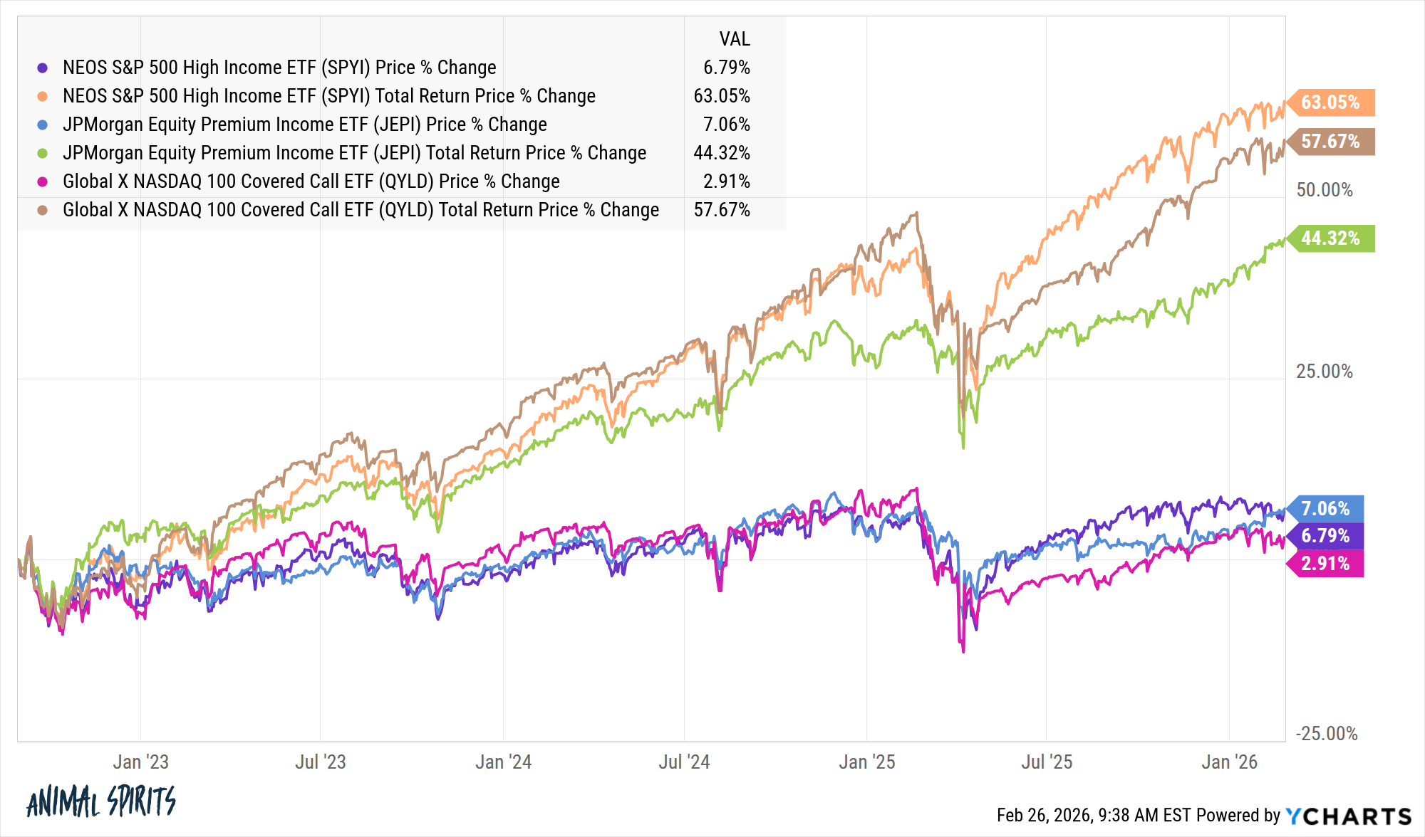Your income also becomes far more variable in these funds. Covered call strategies should fall less than the overall market during a downturn because of the income component but they still own stocks. During the Liberation Day sell-off last year these funds were down anywhere from 16% to 22%.