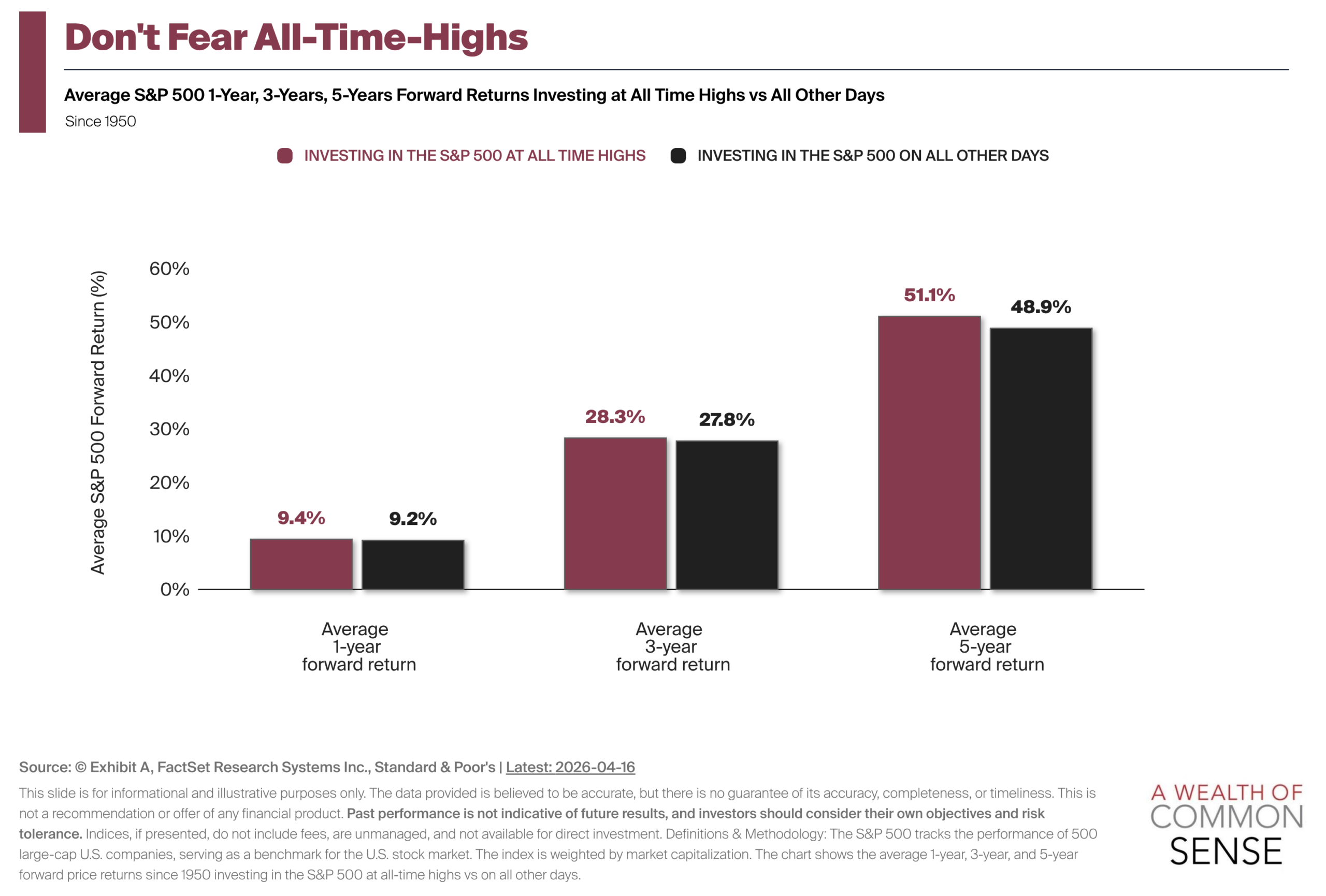 One of my favorite counterintuitive charts shows that average returns tend to be higher from all-time highs than from all other days in the market (via Exhibit A):