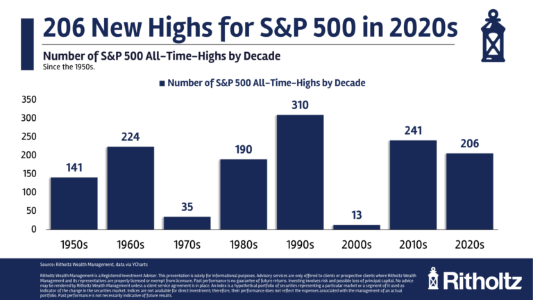 Since 1950, roughly 7% of all trading days have been new all-time highs. The highest percentage of trading days hitting new highs in a decade is the 1990s at 12.3%.1